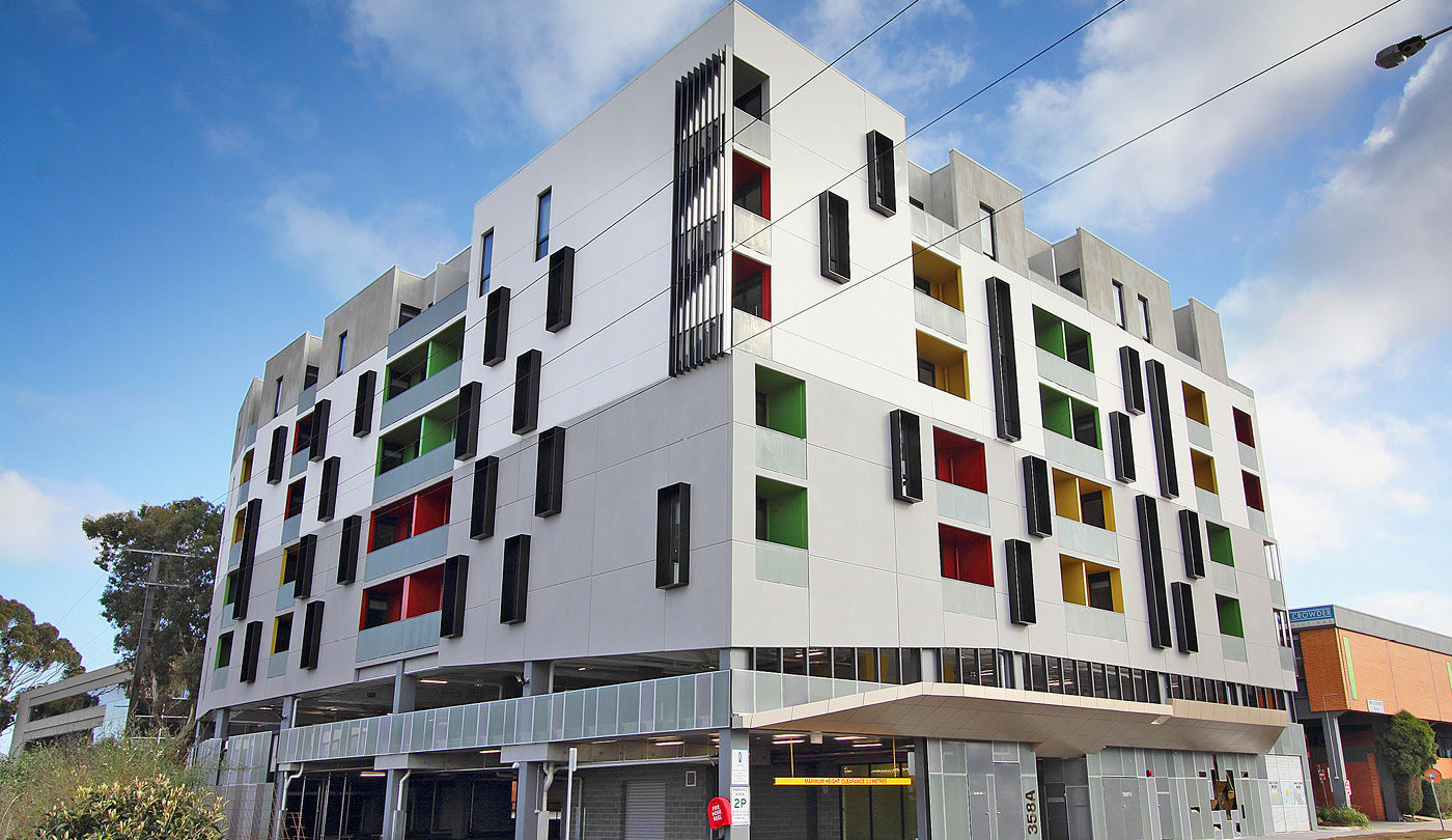 This 1 and 2 bedroom affordable housing project of 75 apartments over 5 levels was built for the Port Phillip Housing Association for people who otherwise might have been excluded from the housing market. Situated on a former council car park this project was built by Pellicano for the MAB Corporation.
